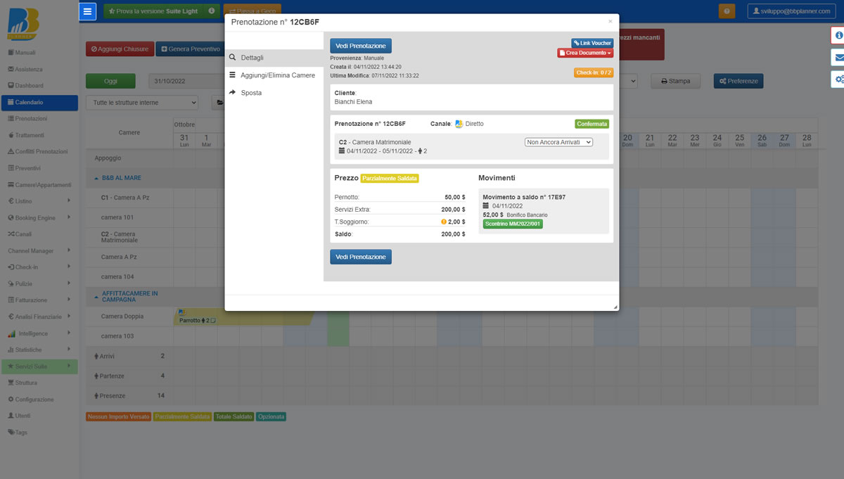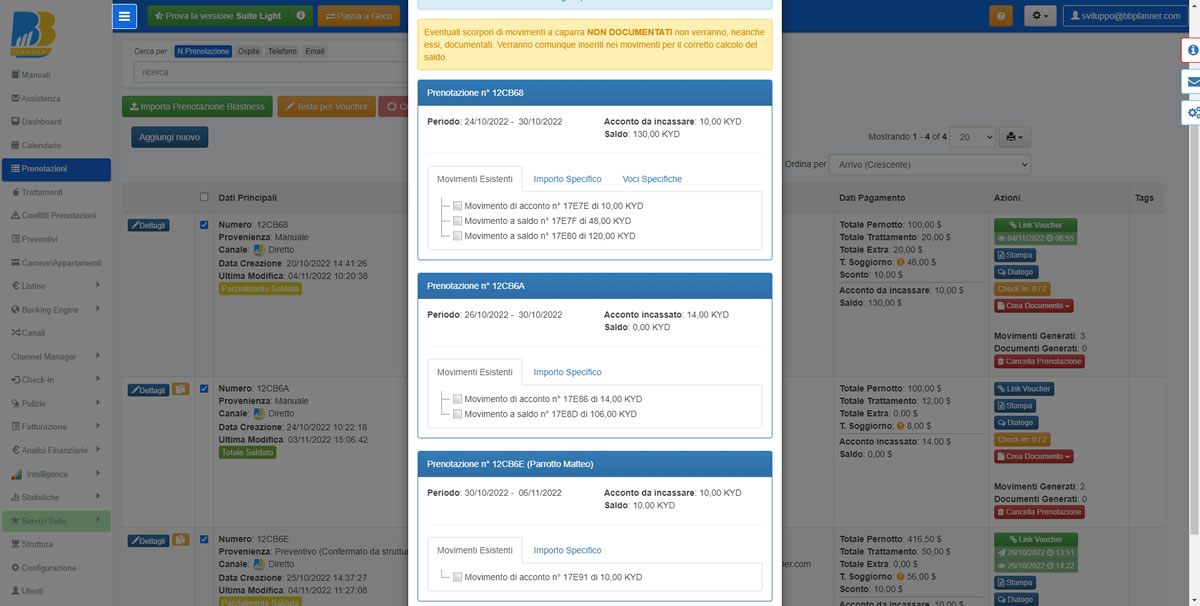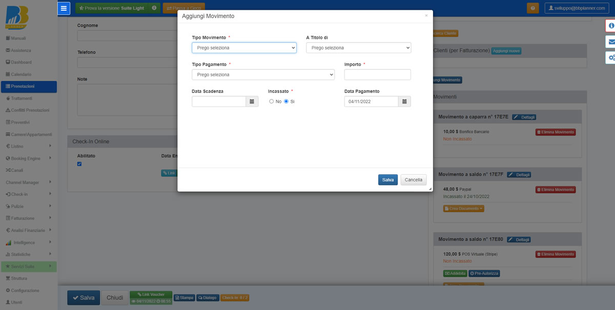 E’ possibile da oggi creare dei movimenti per IMPORTO PARZIALE (specificando se per CAPARRA o per ACCONTO) e/o SALDO (in precedenza i movimenti creati potevano essere solo o A CAPARRA e/o A SALDO).