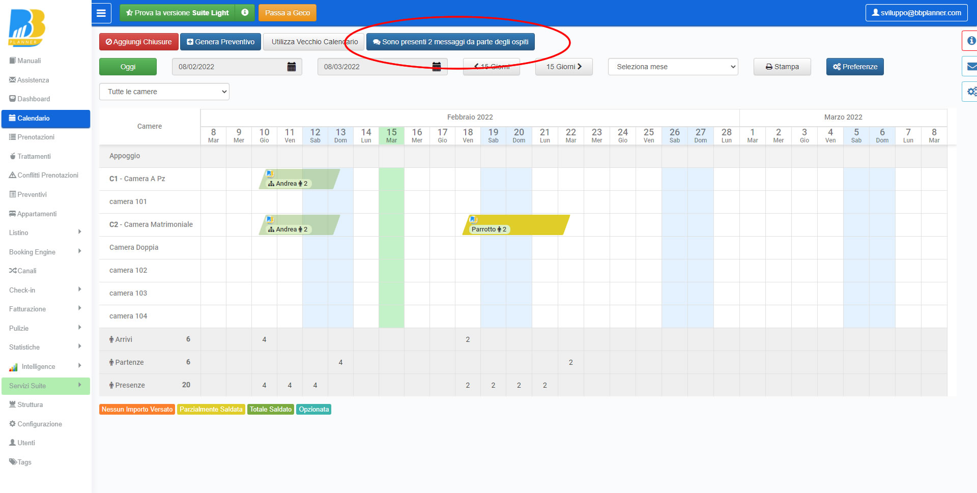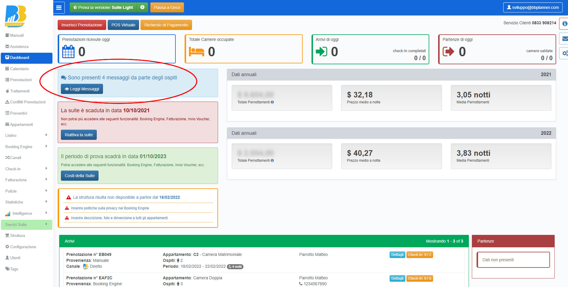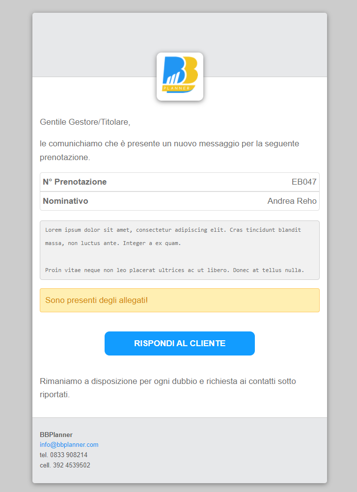 Nell’email di notifica alla struttura di un nuovo messaggio da parte dell’ospite è stato inserito l’intero testo del messaggio e il tasto RISPONDI AL CLIENTE.